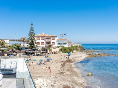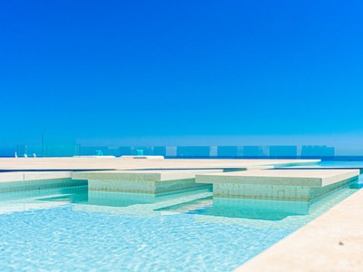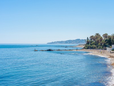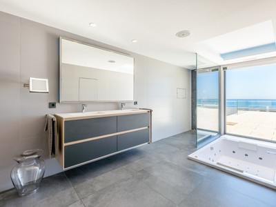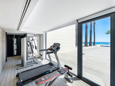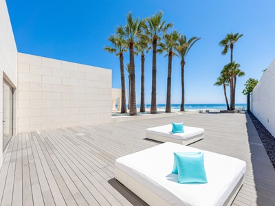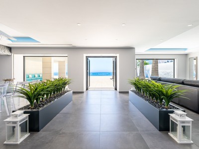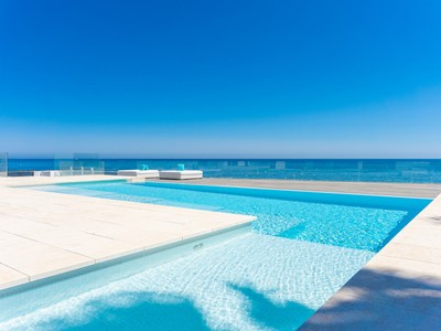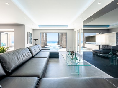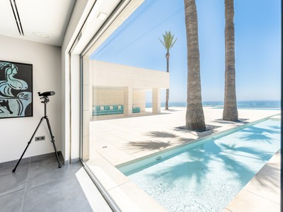A white contemporary beach house, tall palms on the blue sea and sky background… Photos of this property might have you convinced its located in an ultramodern escape in Hamptons, sunny California or oceanfront Miami. In reality, the stunning modern house for sale proudly stands on the very private Mediterranean beach in Mijas Costa, surrounded by the traditional style high-end classic villas. Abundance of glass, open plan concept, geometric volumes, shapes and lines are iconic for the modern contemporary style. However, this villa stands out from all the other modern homes. Its exceptional design is truly outstanding and innovative, reflecting the highest standards in contemporary architecture.